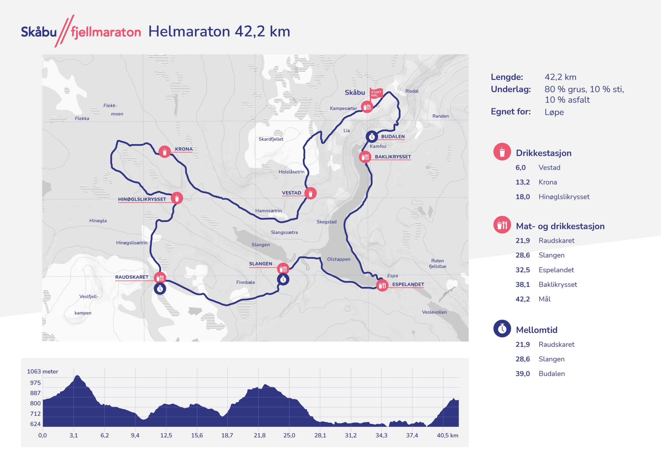 Start og mål i Skåbu sentrum 860 moh. Fra start kommer du raskt ut på grusvei og sti opp til Holslåseter 1050 moh. Deretter fortsetter traseen på stier og grusveier gjennom Murudalen til Flekkmoen og Sikkilsdalsveien. Etter Hinøgelslifossen går traseen bratt opp 3 km til Jotunheimvegen, og deretter ned igjen og rundt fjellvannet Olstappen. Relativt hard avslutning i 3 km opp Kamfossbakken til mål i Skåbu sentrum. Asfalt kun første km samt siste 3 km, ellers grusvei og litt sti.
