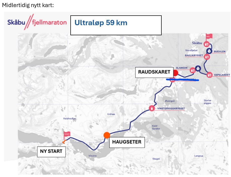 Jotunheimvegen Ultra: Benytter maratontraséen, og en strekning på vegen mot Sikkilsdalen t/r. Dersom maratontraséen ikke kan benyttes, avlyses Ultra.